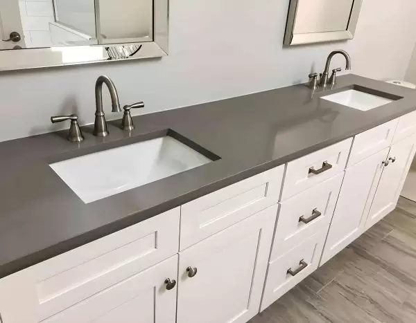 Encimera de baño con dos lavabos bajo encimera y canto inglete realizado en cuarzo gris.