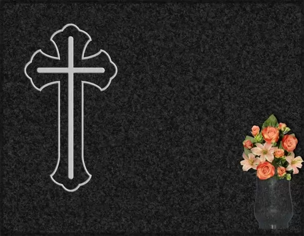 Lápida con cruz de lis grabada sobre granito negro Sudáfrica.