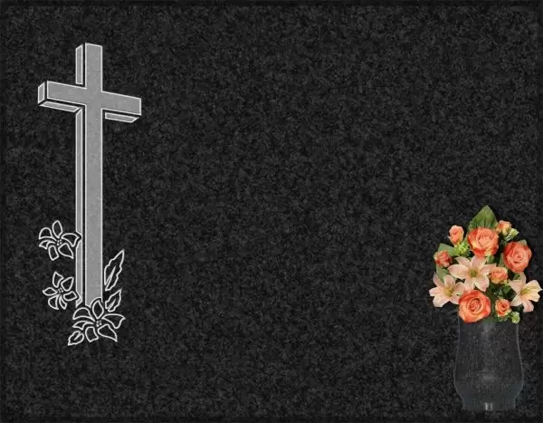 Lápida con cruz entre motivos florales grabada sobre granito negro Sudáfrica.