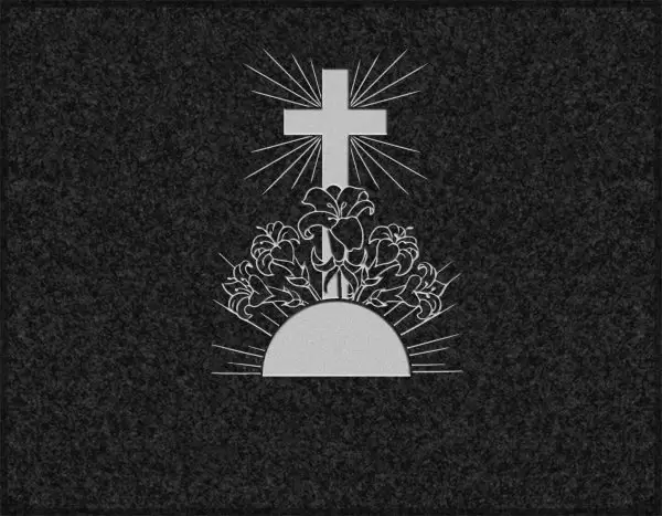 Lápida con cruz tras puesta de sol con motivos florales grabada sobre granito negro Sudáfrica.