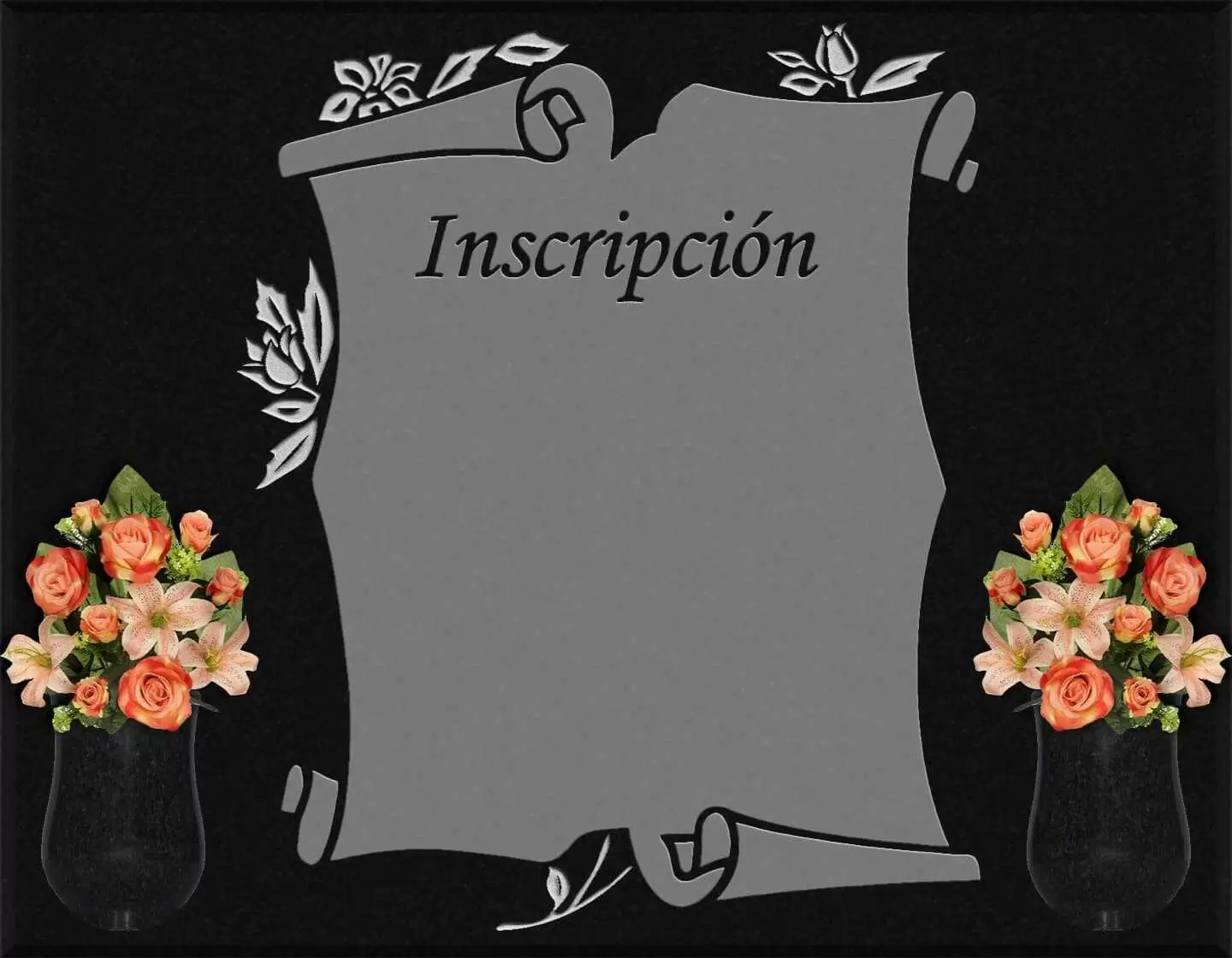 Lápida con pergamino y conjuntos florales grabadas sobre granito negro intenso.