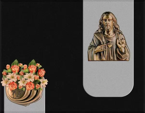Lápida con Sagrado Corazón de Jesús y jardinera de bronce con enmarcado grabado sobre granito negro intenso.
